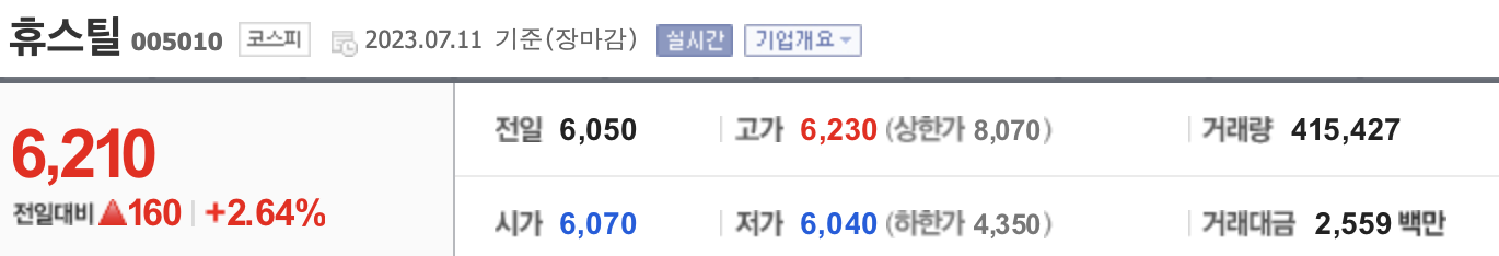 2023년 7월 11일 장마감 기준 휴스텔 주가 : 6,210원.